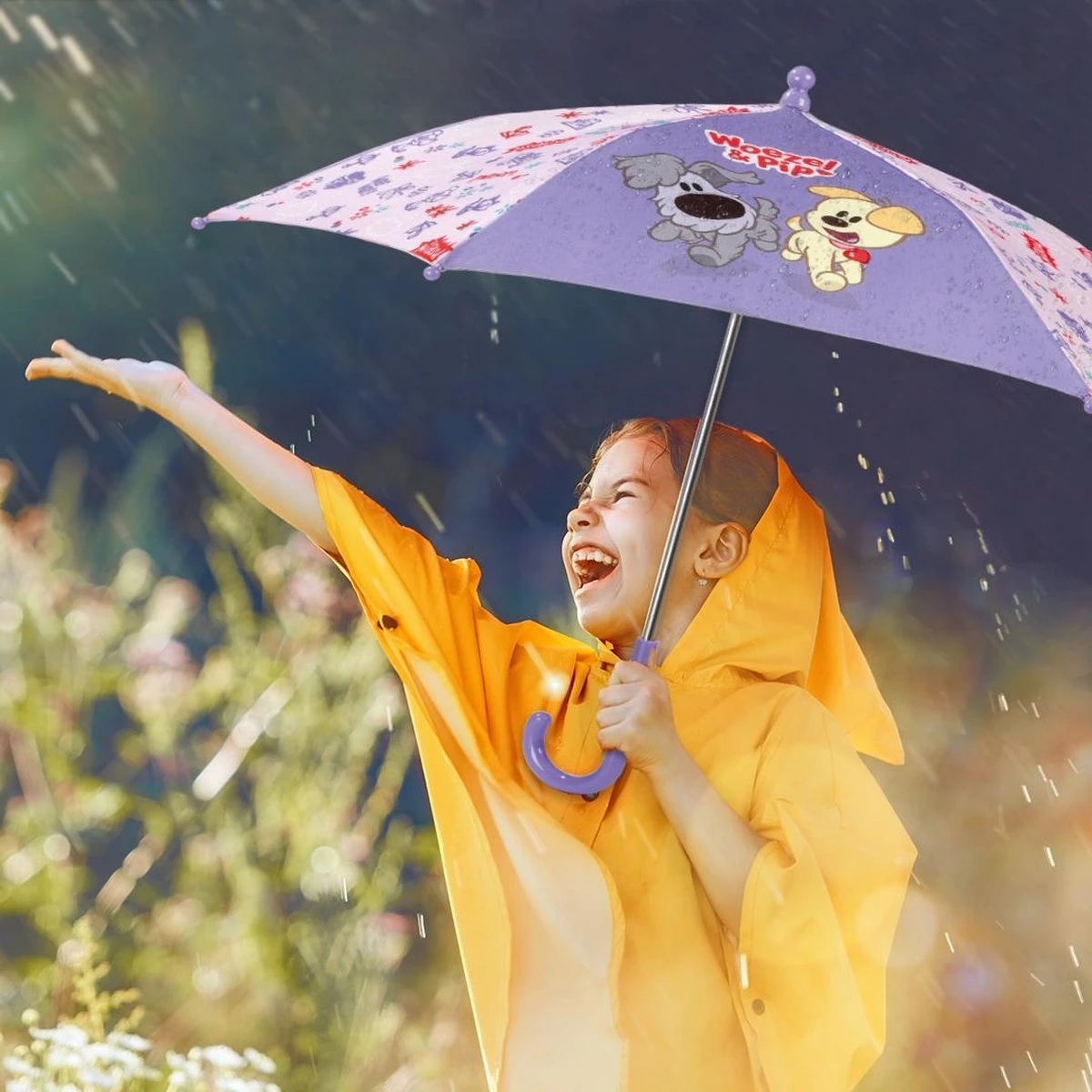 Je kindje blijft lekker droog en stapt vrolijk door de regen met deze mooie paraplu. Hij is geschikt voor kindjes vanaf 3 jaar en heeft een doorsnee van 66 cm. Samen met Woezel & Pip kan je kindje elke regenbui trotseren!