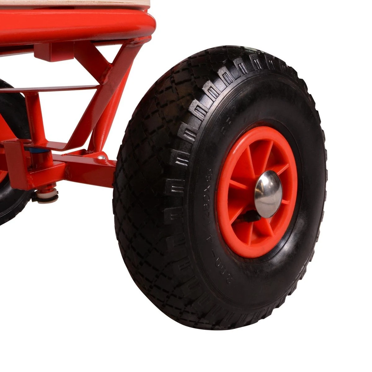 Stoere bolderkar van topkwaliteit voorzien van stalen frame en gelagerde wielen met luchtbanden met een diameter van 25cm. Hij is makkelijk uit elkaar te halen.