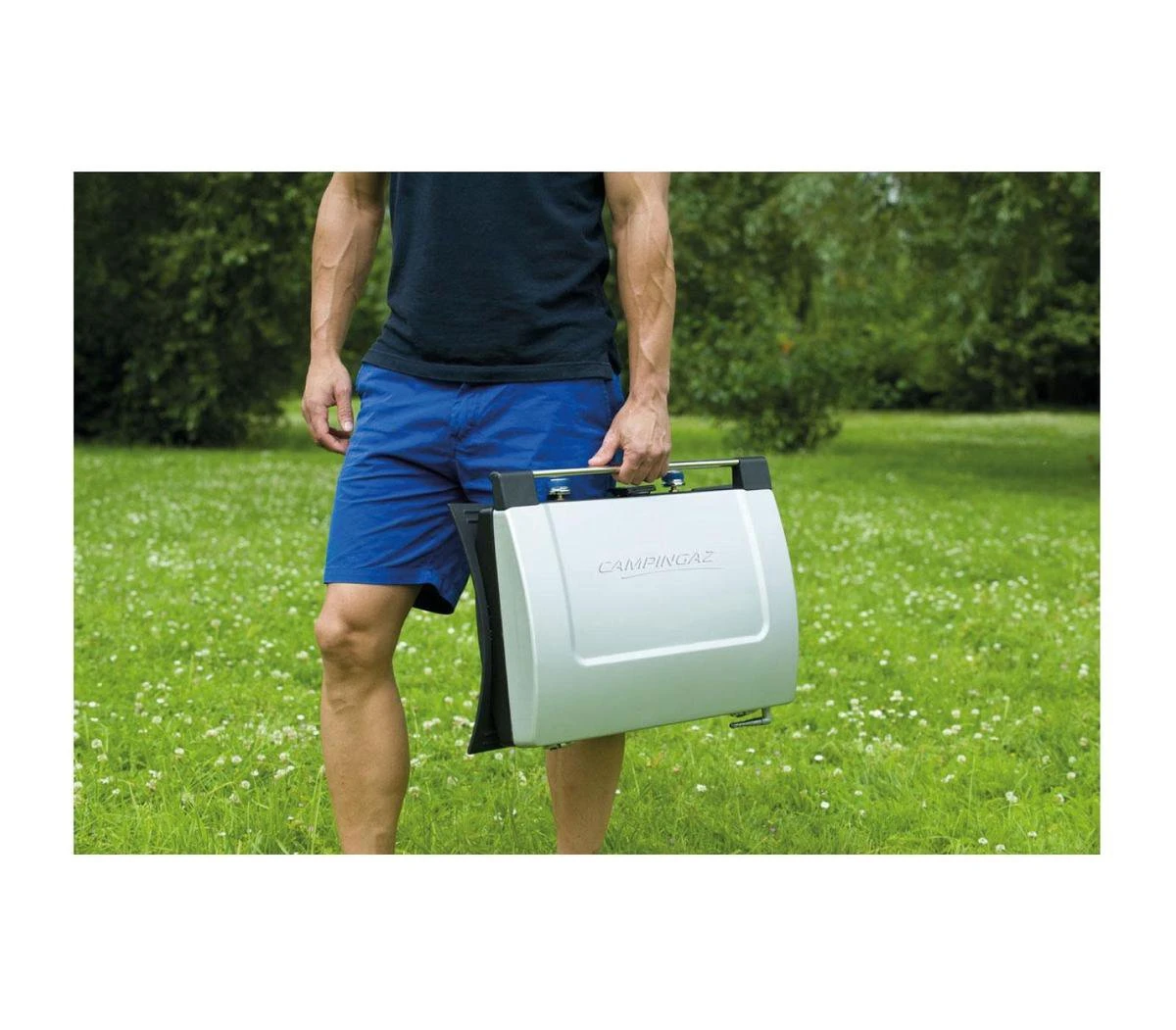 Dit camping gas kooktoestel is zeer eenvoudig te vervoeren door hem in te klappen tot een koffermodel. De uitneembare poten kunnen onder de branders worden bevestigd. Zo kan het camping kooktoestel ook worden gebruikt als tafelmodel. Eenvoudig te ontsteken met de piëzo ontsteking en stabiel af te stellen op een ongelijke ondergrond door de telescopische poten. Op de handige zijtafels hou je kruiden en kookgerei altijd bij de hand.