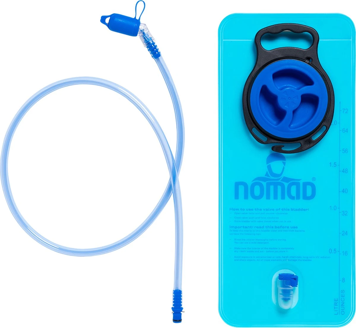 De NOMAD Waterzak heeft een grote opening met anti-lek draaidop, wat het vullen en schoonmaken van de zak heel gemakkelijk maakt. De drinkslang van de waterzak heeft een lengte van 105 centimeter waardoor het drinksysteem te gebruiken is bij rugzakken in alle denkbare maten. De slang heeft een handig kliksysteem waarmee je ‘m gemakkelijk ontkoppelt van of vastklikt aan de waterzak. Aan het uiteinde van de slang bevindt zich een bijtventiel die af te sluiten is met het dopje om lekken te voorkomen. De slang maakt het gemakkelijk om te drinken, zonder de waterzak uit je tas te hoeven halen. Ideaal als waterzak voor trekking of fietstochten!