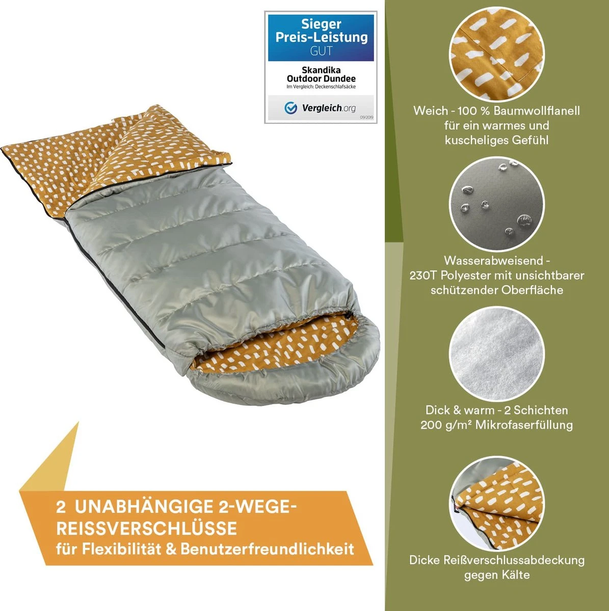 De Dundee is verkrijgbaar met de rits aan de linker- of rechterkant. Een slaapzak met een rits aan de linkerkant kan worden gekoppeld aan een slaapzak met een rits aan de rechterkant om een grote slaapzak voor koppels te maken.