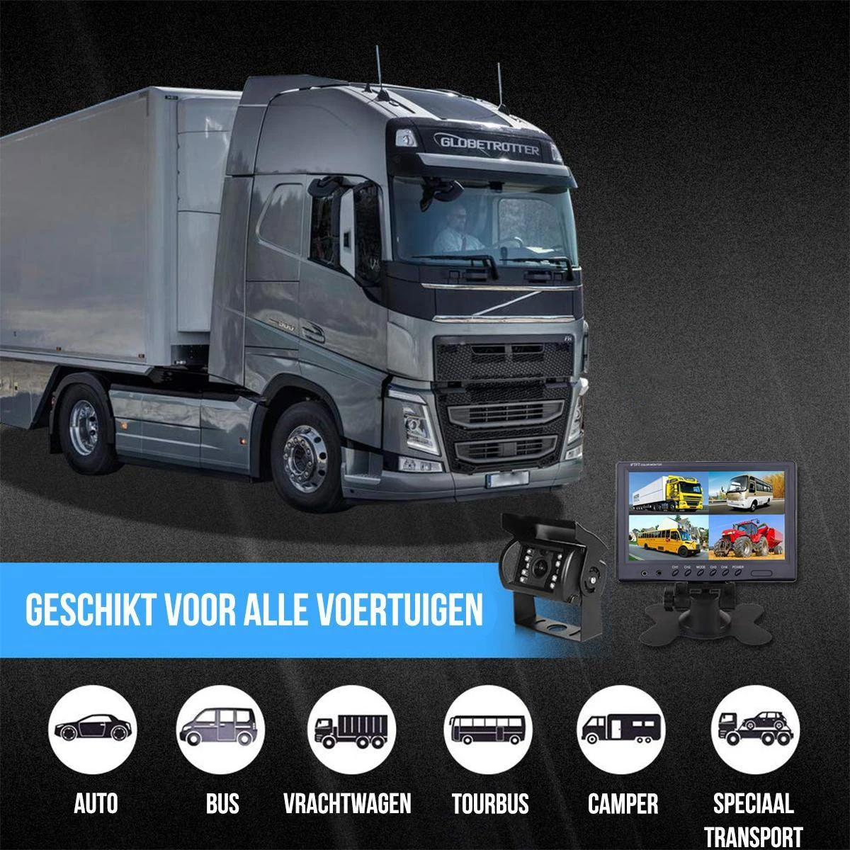 Doordat deze set met draad werkt zijn problemen met het signaal verleden tijd en ben je altijd verzekerd van een optimaal ontvangst. Naast de ontvanger is er enkel een stroomaansluiting nodig welke op meerdere punten in het voortuig kan worden afgetakt zoals bij de verlichting. Zowel het 9” displayscherm en de achteruitrijcamera werken beide op 12/24V DC.