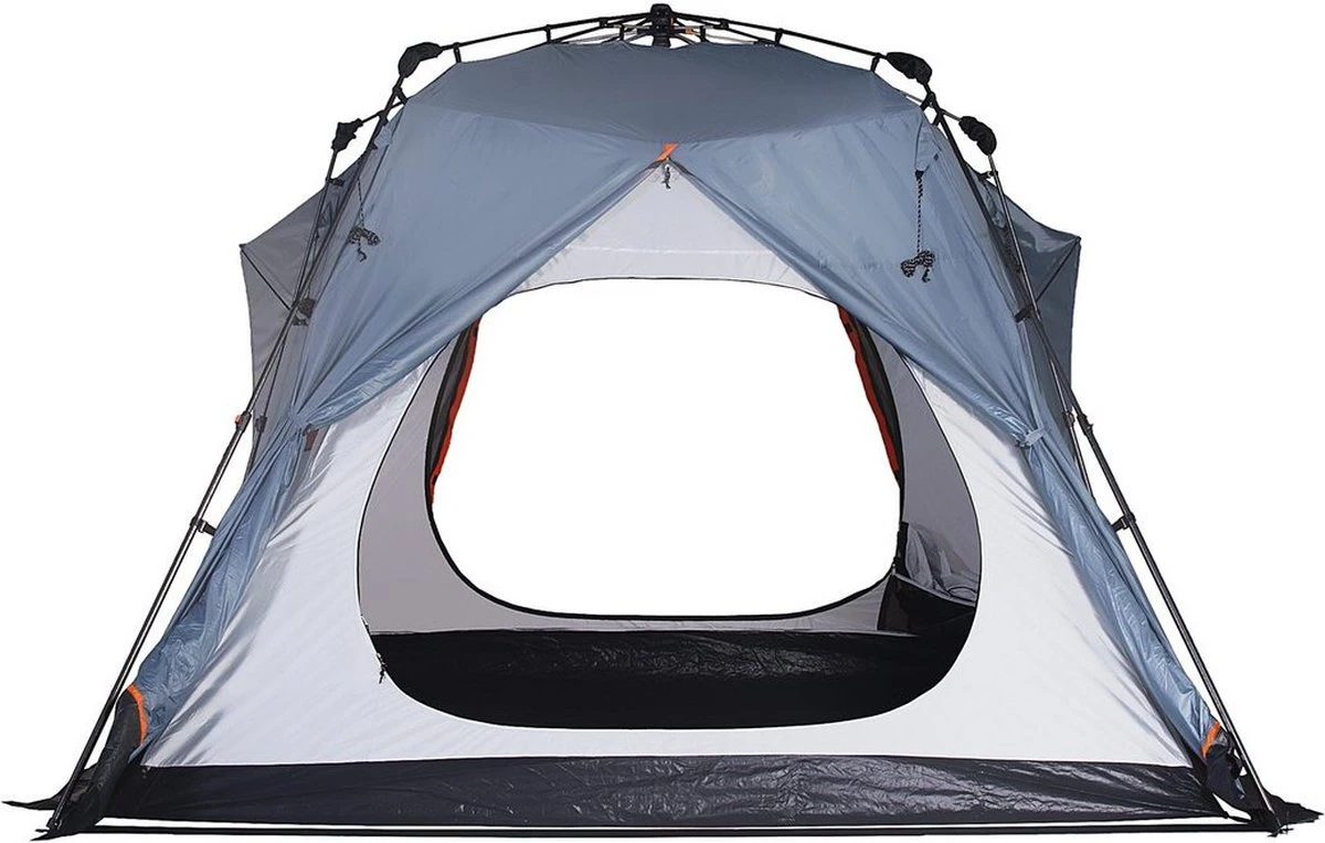 Innovatief vouwsysteem, ultrasnel Quick Up-opbouwen: dankzij het slimme opbouwsysteem kan de tent in een paar stappen snel en gemakkelijk opgezet en net zo snel weer afgebroken worden. Heel gemakkelijk, ook als u het nog nooit hebt gedaan. U hoeft alleen aan het veiligheidskoord te trekken, de tentstokken uit te vouwen en tenslotte met de bijbehorende haringen de tent vast te zetten – de tijdrovende ouderwetse manier is verleden tijd.